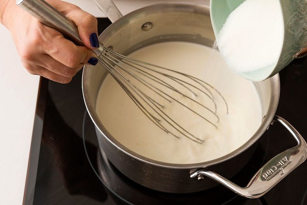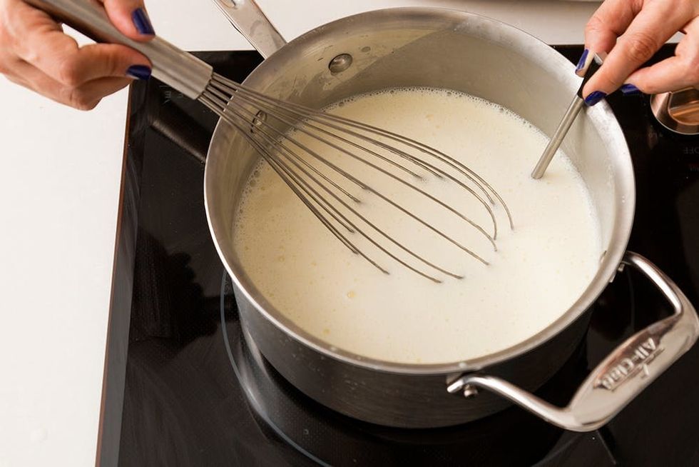 3. Whisk in 1/4 cup of the hot cream into the eggs. Gradually pour in the remaining hot milk into the yolks, whisking continuously until combined.