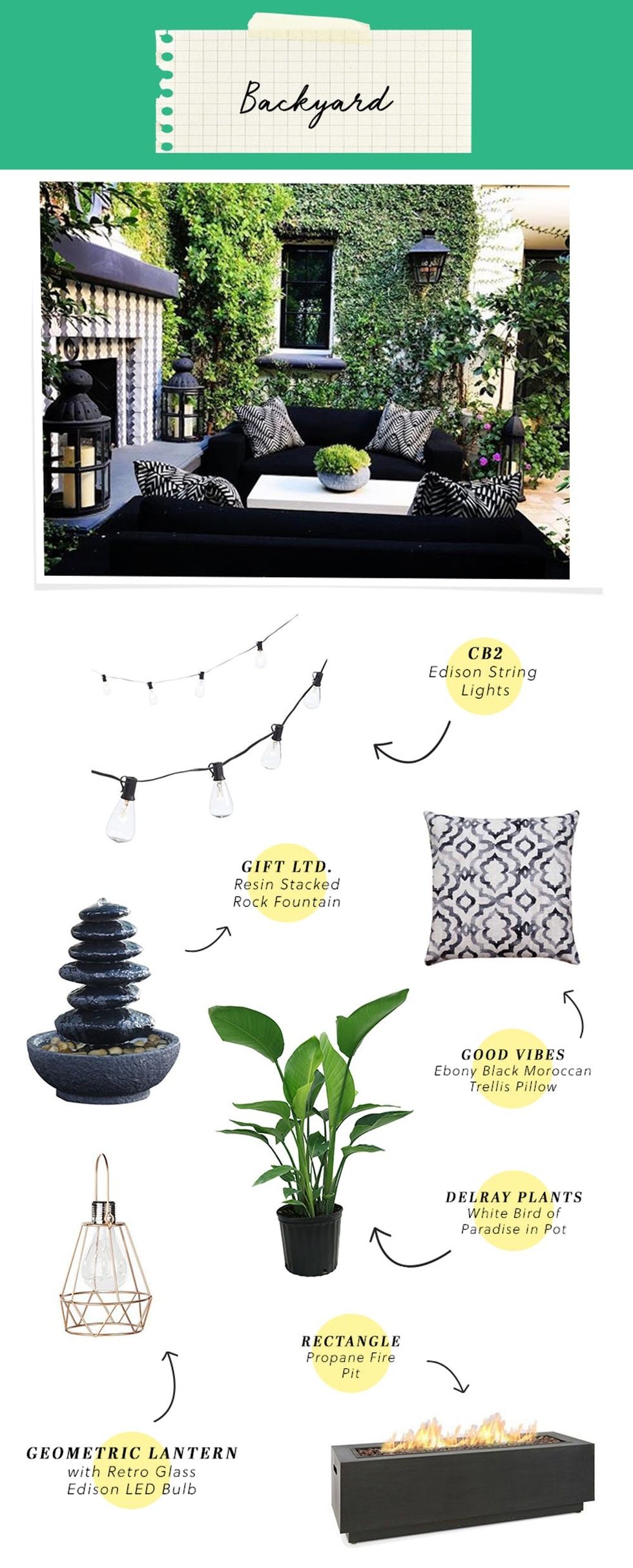 Clockwise from top: CB2 Edison String Lights ($40), Land of Pillows Good Vibes Ebony Black Moroccan Trellis Pillow ($22+), Delray Plants White Bird of Paradise in Pot ($38), Real Flame Lanesboro Rectangle Propane Fire Pit ($330), HSN Smart Solar Geometric Lantern With Retro Glass Edison LED Bulb ($10), Hi-Line Gift Ltd. Resin Stacked Rock Fountain ($98)
