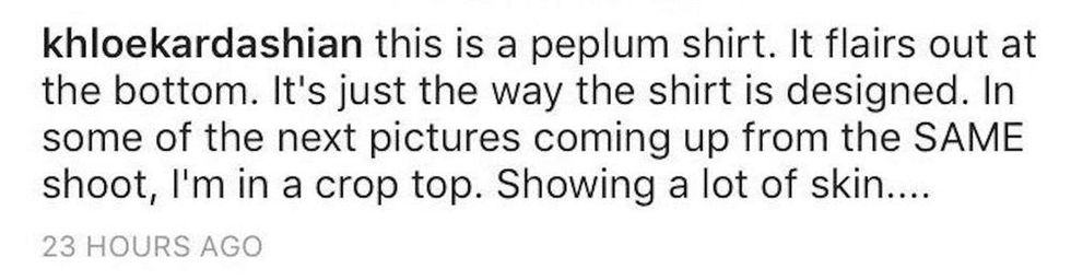 As captured in a screenshot by a fan, Kardashian, 33, chose to weigh in on the matter herself, writing, “This is a peplum shirt. It flares out at the bottom. It’s just the way the shirt is designed. In some of the next pictures coming up from the SAME shoot, I’m in a crop top. Showing a lot of skin…”