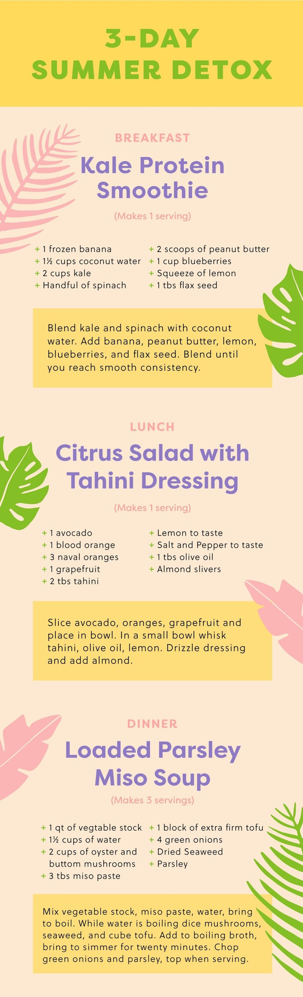 These meals are packed full of protein and healthy fats, so they’ll leave you feeling full and your body nourished. Start your day off right with a kale smoothie. Because kale is high in fiber, minerals, and nutrients it promotes digestion and detoxification. It’s the perfect way to kick-start your body in the morning. A citrus salad for lunch will bring in an extra dose of Vitamin C which boosts your immunity and helps prevent free radicals from damaging your cells. As for dinner, miso is a great way to introduce fermented foods into your detox. Fermented foods stimulate digestion and energize your body.