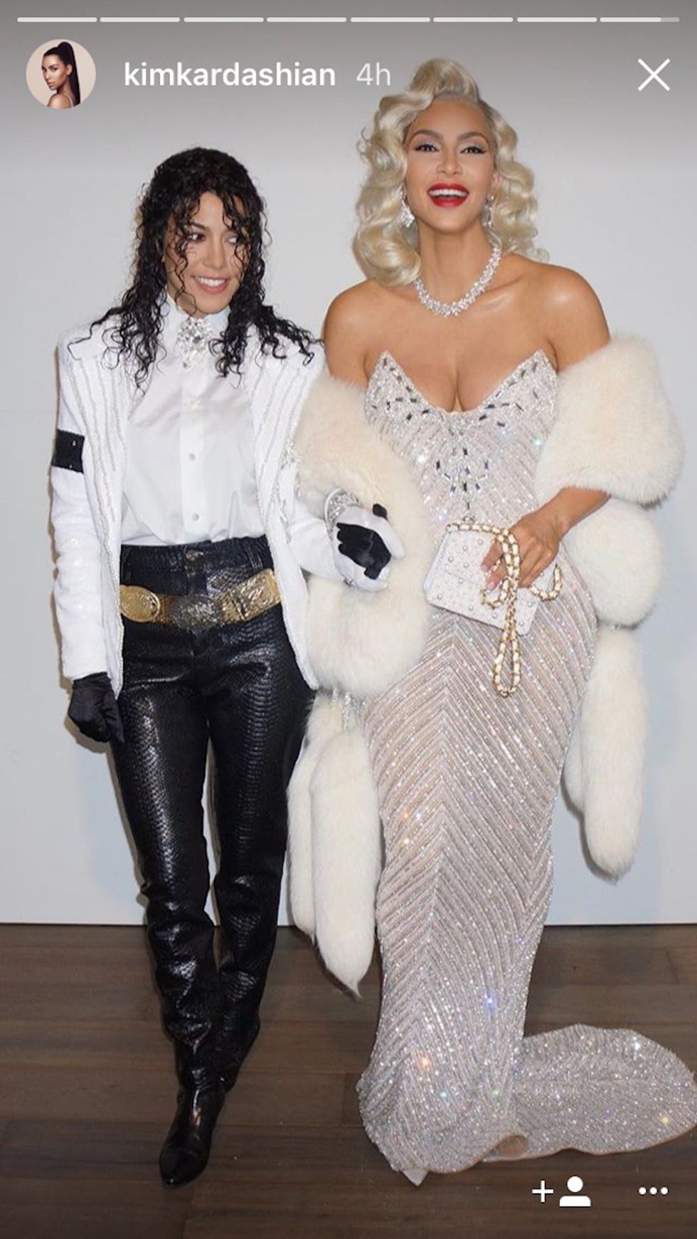 Donning a slinky white sequined gown with a (faux?) fur stole, a little white clutch, and a diamond statement choker, Kardashian West, 37, was the perfect Madonna to sis Kourtney’s Michael Jackson. Scott Disick’s ex, meanwhile, played the “Beat It” singer to a tee in a pair of leather pants, a gold belt, white blazer, black gloves, and ultra-curly wig.