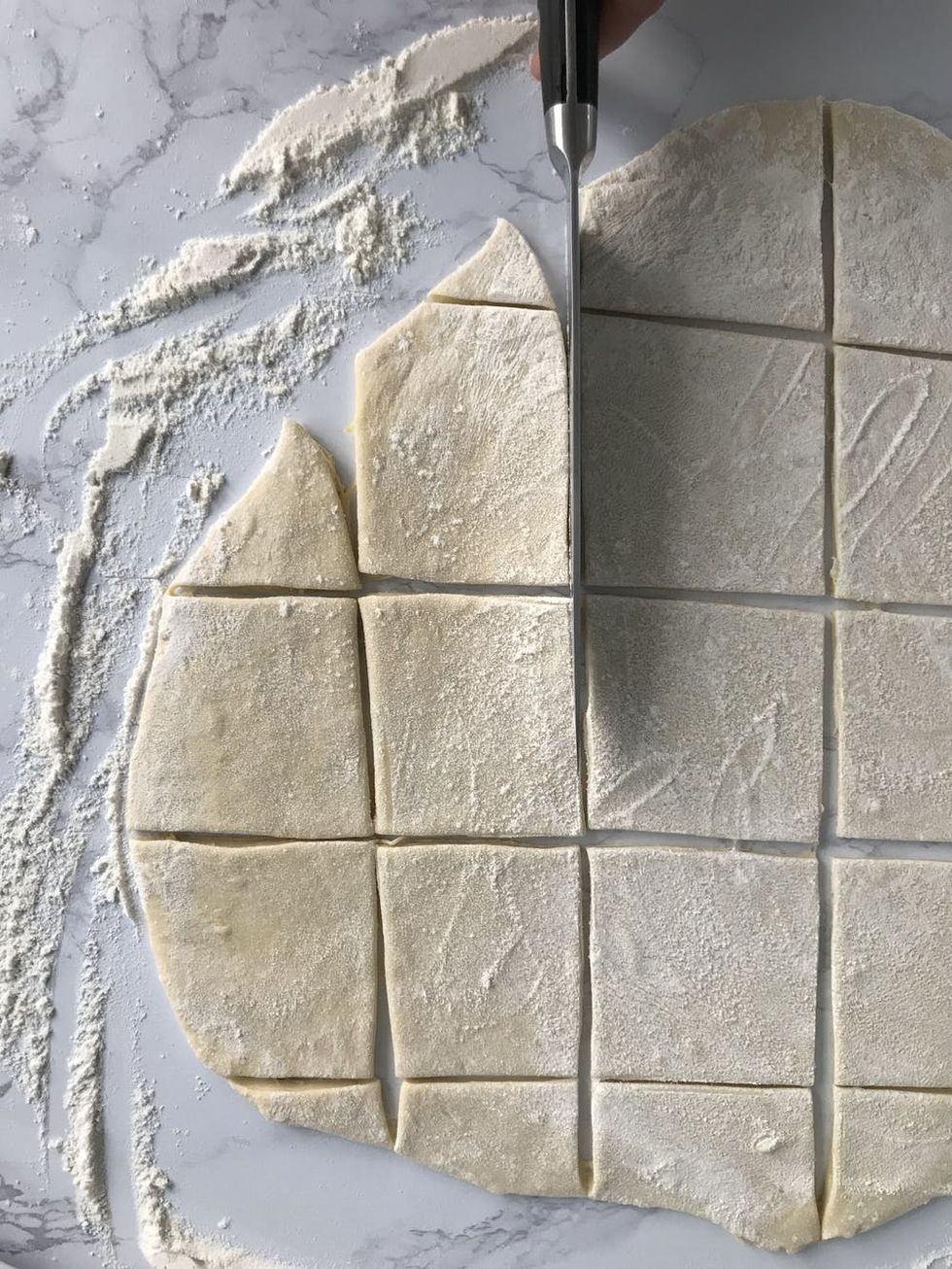 - Remove the dough from the refrigerator and lightly flour your work surface. Cut the dough into quarters and then roll the dough out to approximately 1/8 inch thick. Cut into squares. Keep going with the remaining dough.