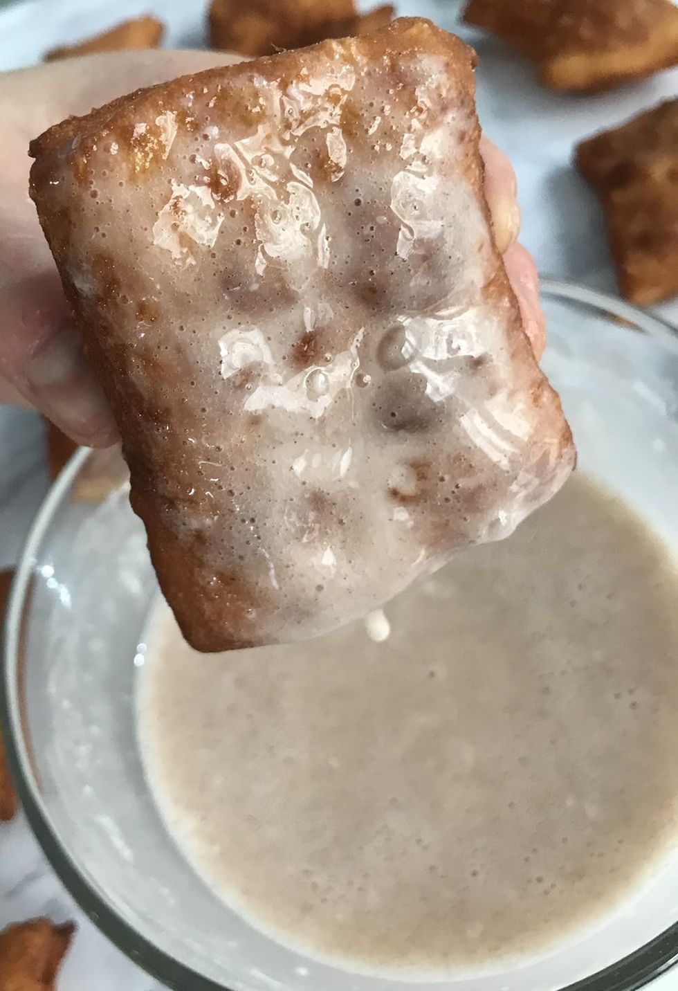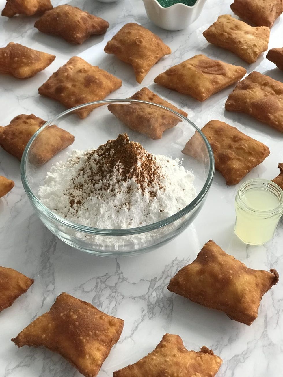 - While the beignets are cooling, in a bowl mix together confectioner’s sugar, remaining cinnamon, lemon juice, and water until a glaze is formed. Dip the tops of the beignets in the glaze and sprinkle with colored sanding sugar.