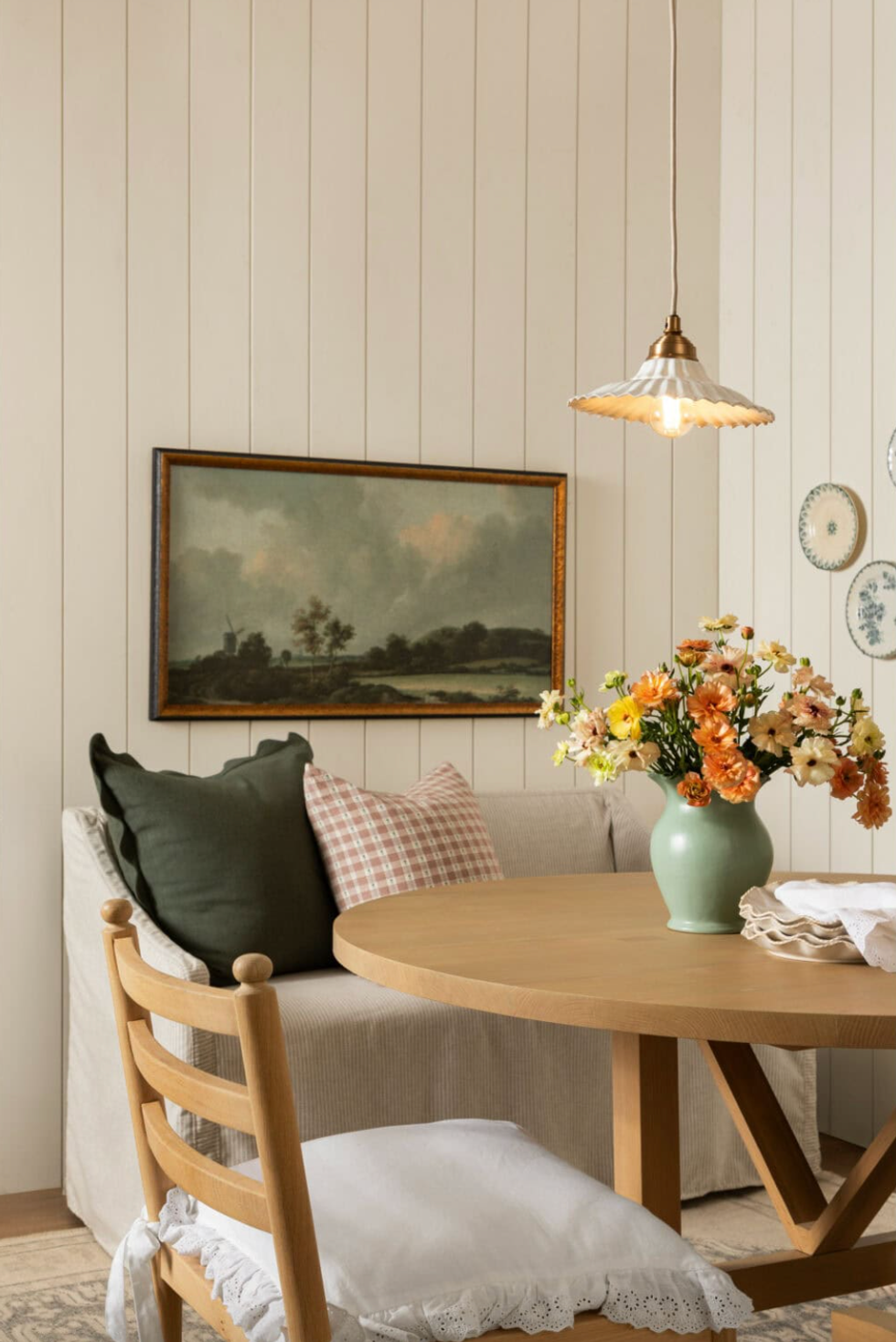 This wood-framed banquette is a refined take on the classic cottage-style design, bringing warmth and charm with an elevated touch. Paired with a bold natural-fiber chandelier and cottage-inspired plates on the wall, it creates a cozy-yet-stylish dining nook that I admire.