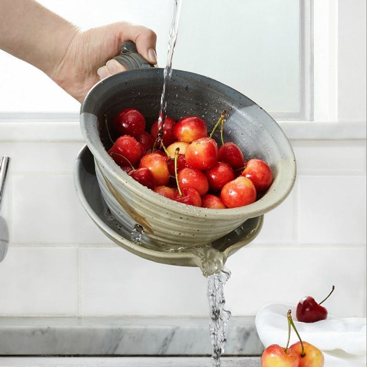 Part kitchen tool, part stoneware art, this strainer both stores and rinses berries with style.