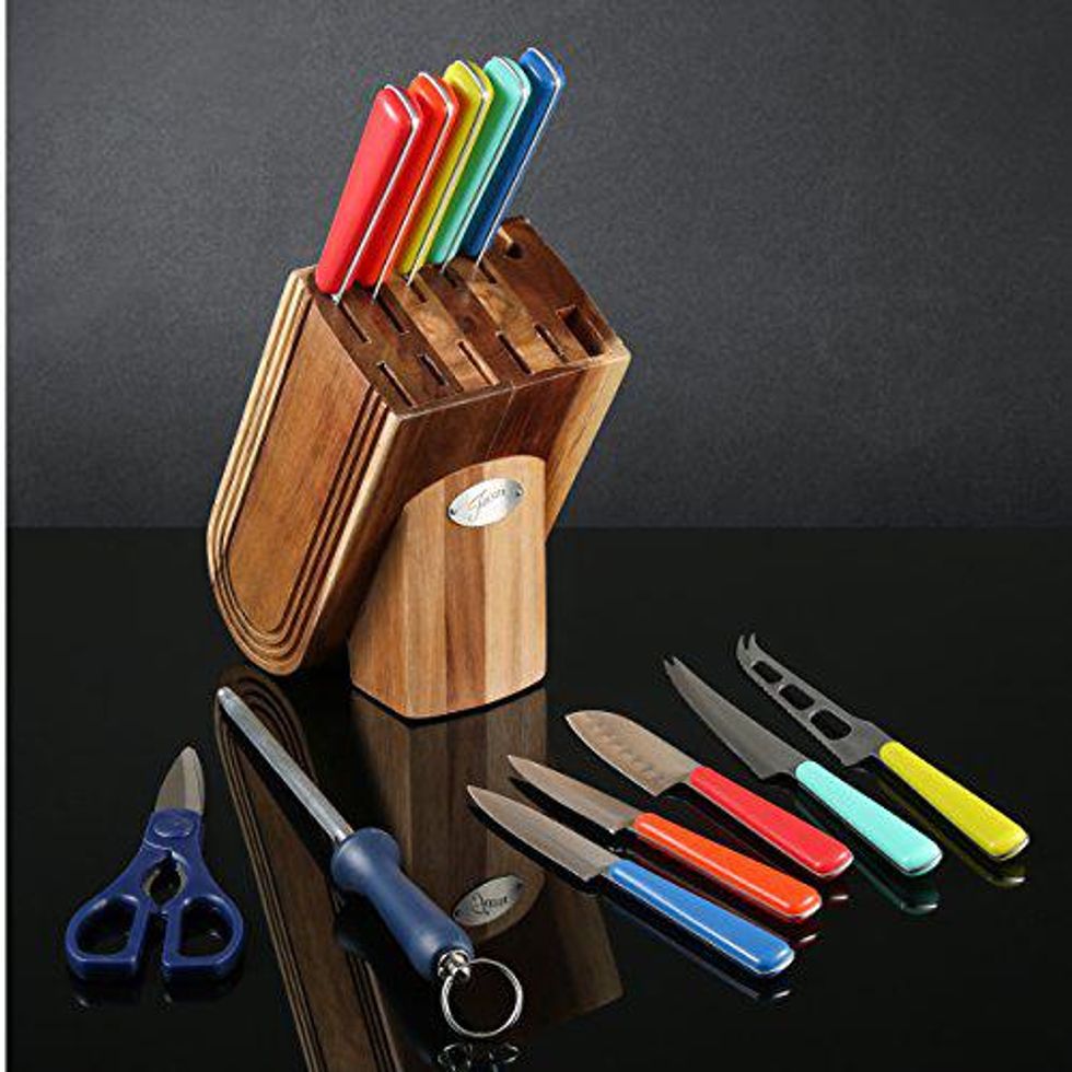 Grab this colorful knife block from the well known and well loved Fiesta brand to add to your kitchen counter. The block itself is solid and substantial, with a unique shape to it. The knives add some much needed colorful accessories to display that will bring you joy just by looking at them! The entire set is incredibly “sharp” looking. You’ll use these knives every day, you might as well add a slice of fun to your meal preparation.