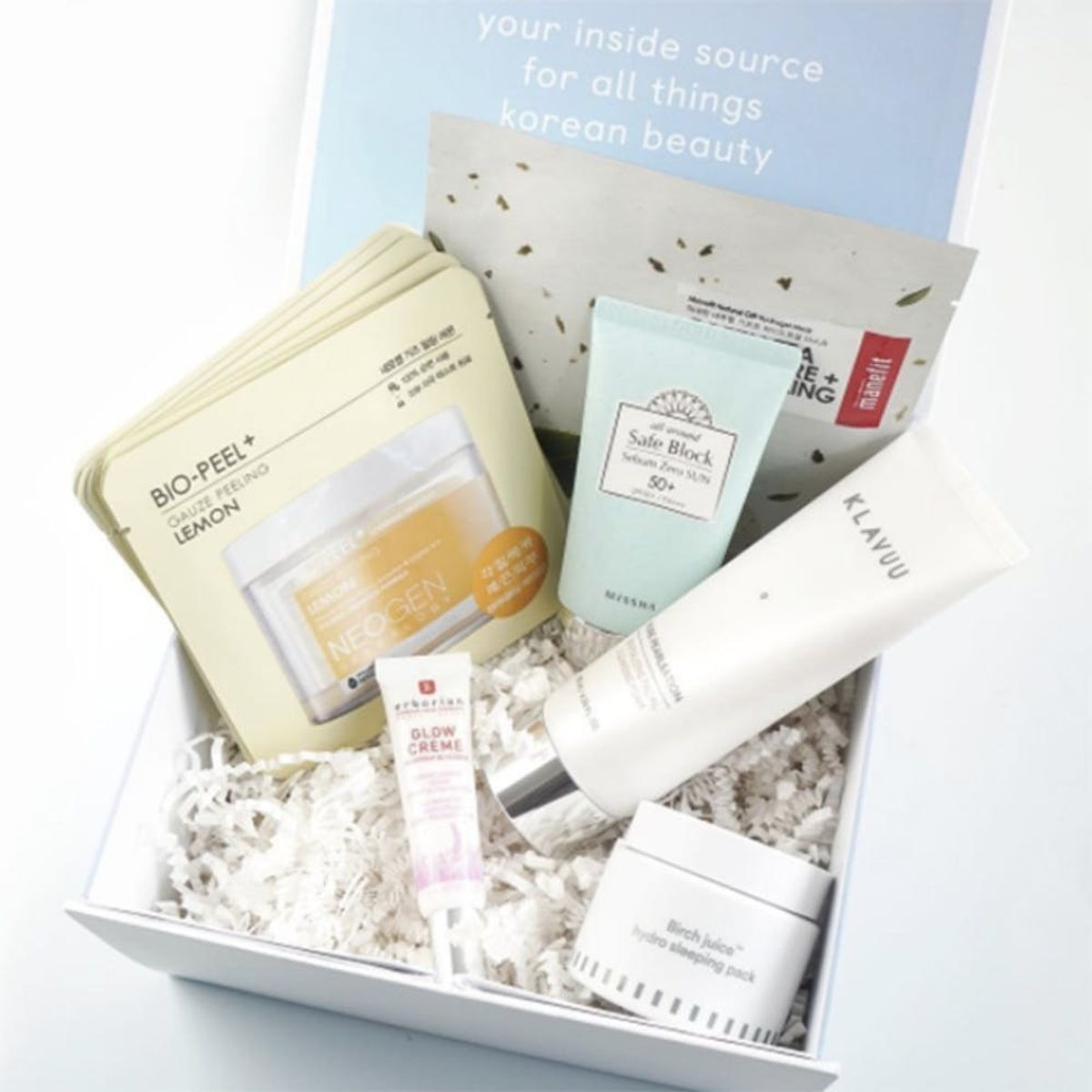 The box — which has a $100+ value BTW — contains new products that novices and experts alike will fall for: Klavuu Pure Pearlisation Revitalizing Facial Cleansing Foam ($30), Neogen Bio-Peel Gauze Peeling Lemon Pads ($27), Manefit Natural Gift Green Tea Pore Care Sheet Mask ($19), E Nature Birch Juice Hydro Sleeping Pack ($28), Missha All Around Safe Block Sebum Zero Sun SPF 50+/PA+++ ($14), and Erborian Glow Crème Illuminating Face Cream ($42).