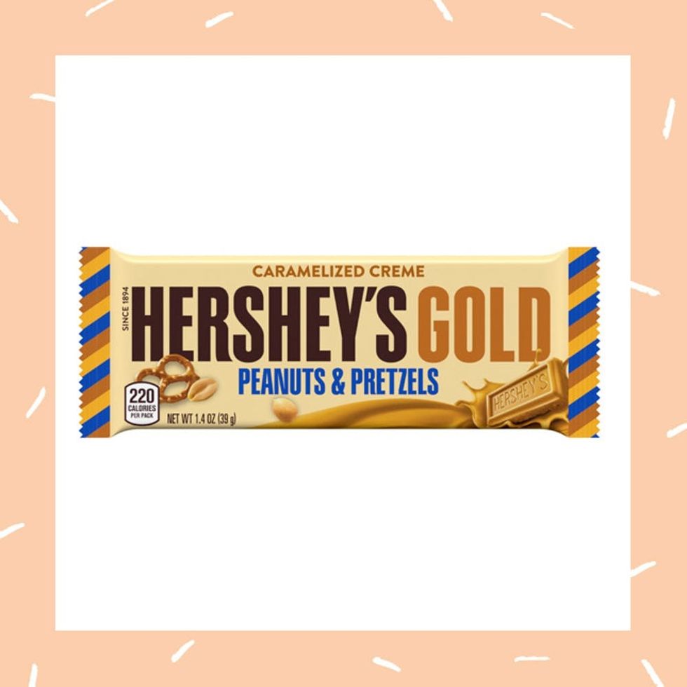 Unlike the chocolatier’s normal cocoa-based classics, Hershey’s Gold is comprised of a classic glazed Krispy Kreme donut that’s topped with salted caramel icing before being sprinkled with Hershey’s latest candy creation, the Gold bar, which doesn’t contain any *actual* chocolate — instead, it boasts a “caramelized creme,” laced with peanuts and pretzels (AKA sweet and salty perfection).