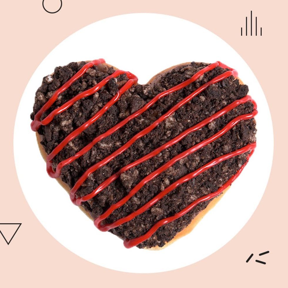 As Krispy Kreme confirmed in a press release, the treat is made up of an unglazed, heart-shaped donut filled with an Oreo cookie “kreme,” then dipped in dark chocolate and topped with Oreo cookie crumbles plus red icing drizzle. YUM.