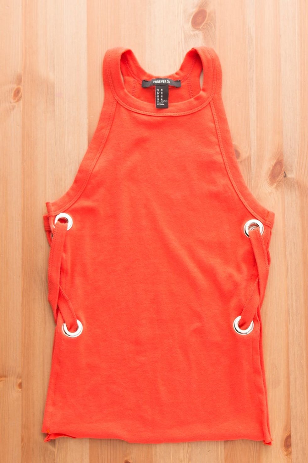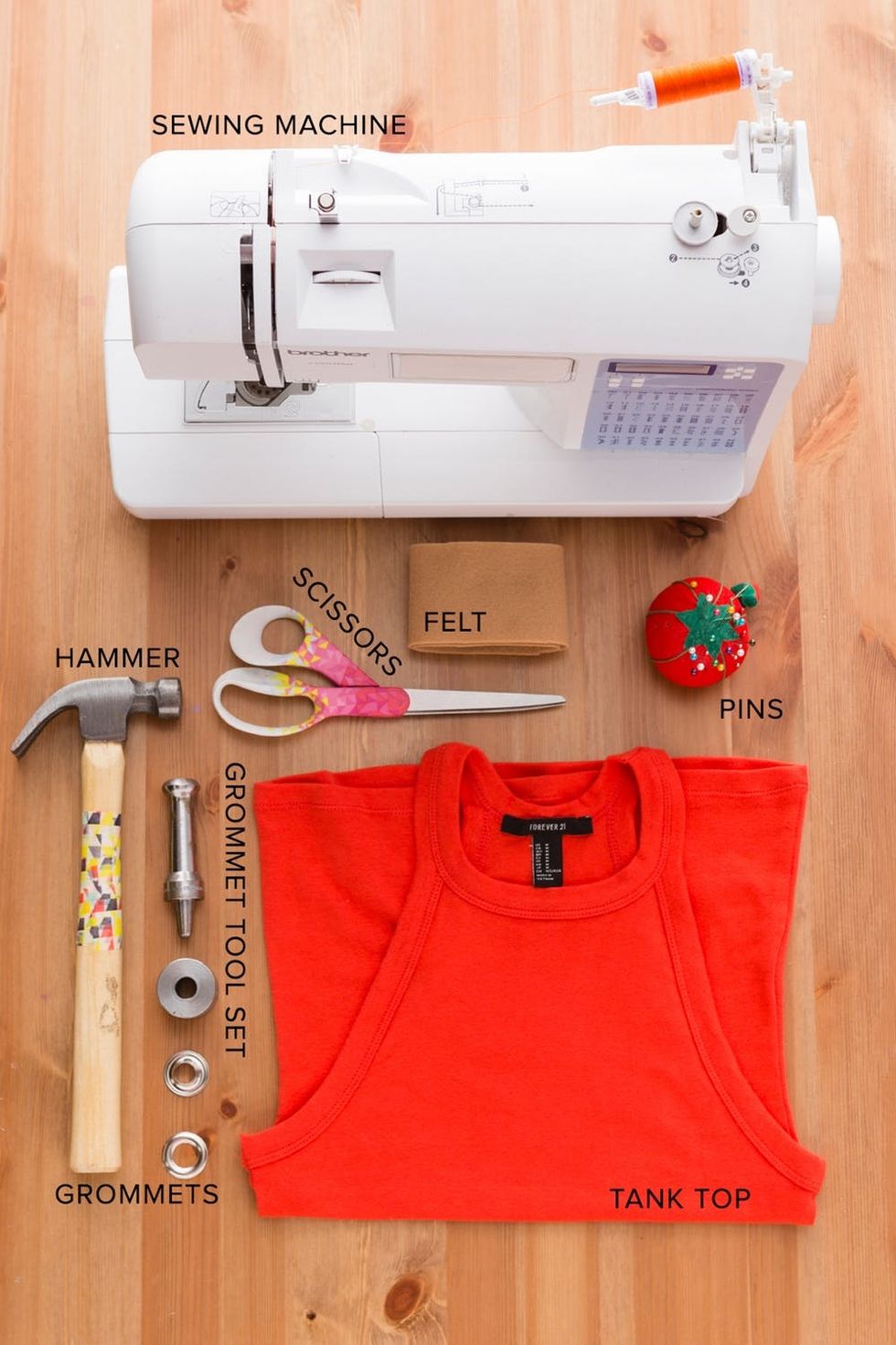 This summer, we’ve been seeing a ton of fun fashion with interesting cuts, off-the-shoulder shirts, and added embellishments. We were especially fans of the Silence + Noise Selena Lace-Up Tank Top ($54) from Urban Outfitters, with the sexy sides and great use of hardware. So we tried our hand at hacking our very own version! Taking a $8 tank top, we transformed it into a summer-ready lace-up tank with a bit of simple sewing and a grommet tool. Scroll on to see how it’s done.