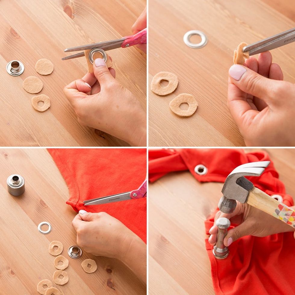 Next, add the grommets. You’ll want to make a washer first out of felt to protect your fabric from the sharp edges of the grommet. Cut around the grommet and make a hole in the center. It will be hidden, so you don’t have to be exact. There are two pieces to the grommet: One looks like a little hat and the other is a ring. Turn your shirt inside out, so the side seam is facing you. Cut a little hole in your shirt for the *hat* part of the grommet to go through. Next, place the felt washer around the *hat* part, followed by the grommet ring. Your grommet stack should be as follows: grommet *hat,* tank fabric, felt washer, and grommet ring. Use the grommet tool base to hold your grommet stack and hammer down. Make sure you’re taking even swings, so the grommet installs straight.