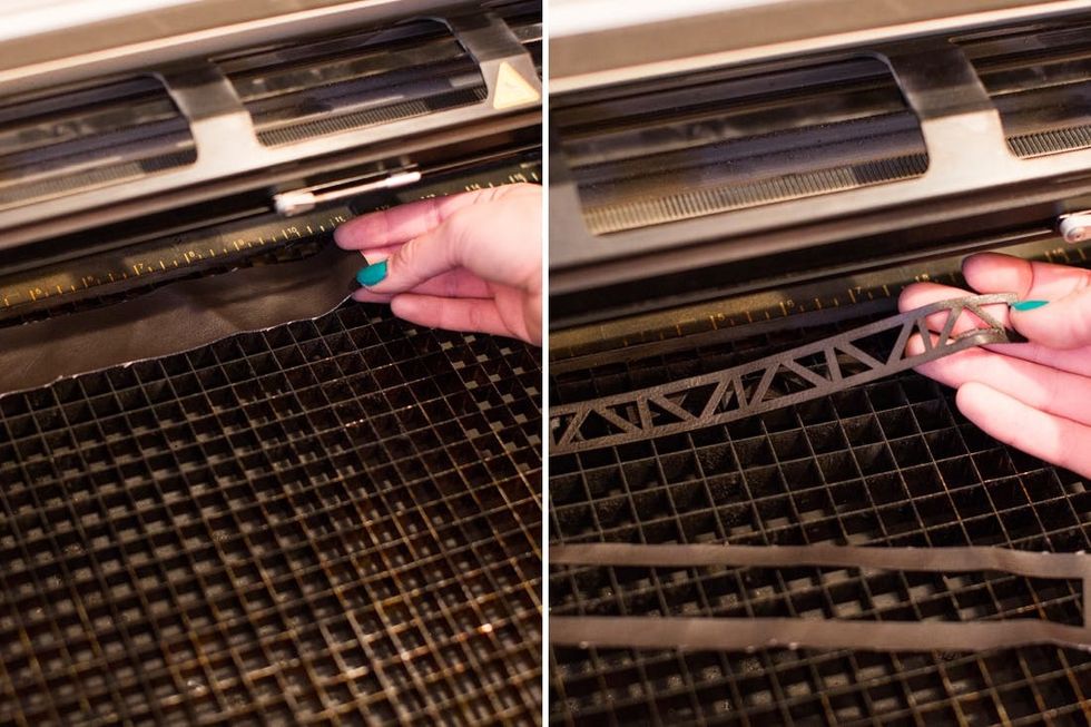 We LOVE our laser cutter and are so fortunate to have one in our office. If you don’t have access to a laser cutter, try using an xacto knife to cut out geometric shapes from your leather.
