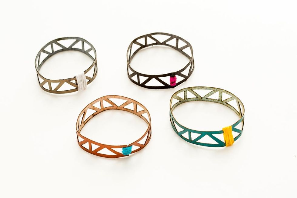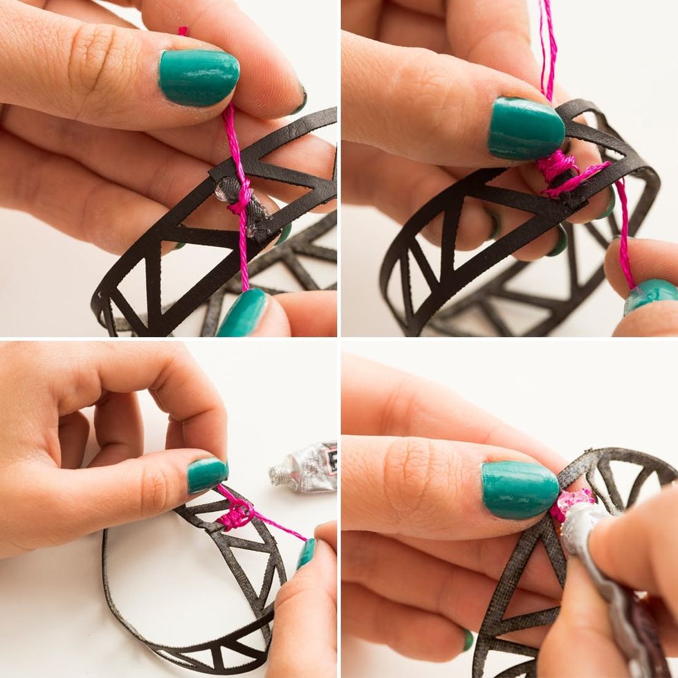 One of the best ways to dress up any outfit is with an arm party. But tons of bracelets on your arm can be heavy! We used our trusty laser cutter to create custom cutout leather bangles that will amp up your style in a matter of minutes. Wrap them with fun colors of embroidery floss to give the party a pop of color.