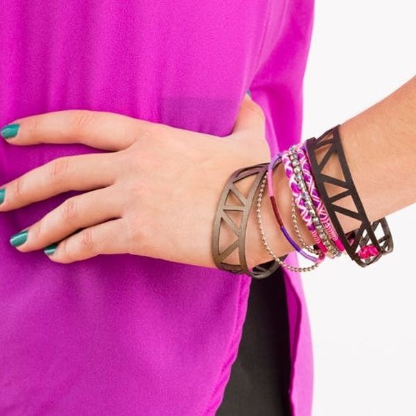 One of the best ways to dress up any outfit is with an arm party. But tons of bracelets on your arm can be heavy! We used our trusty laser cutter to create custom cutout leather bangles that will amp up your style in a matter of minutes. Wrap them with fun colors of embroidery floss to give the party a pop of color.