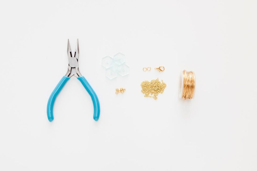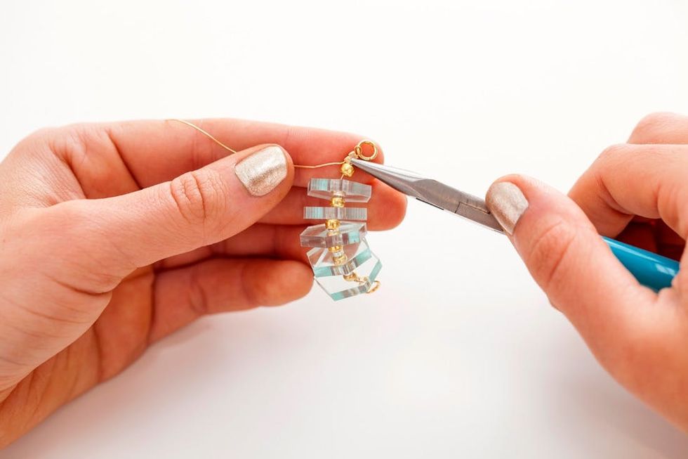 Next up, string six gold beads and five acrylic tiles onto your wire, in an alternating pattern.