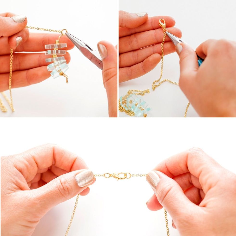 Lastly, attach two jump rings and the lobster clasp to the chain ends, and that’s one necklace down!
