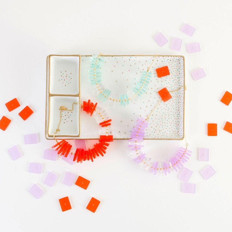 We’re loving these playful colors and textures. It’s like a party garland you can wear around your neck… without looking like you had one too many mimosas at brunch…!