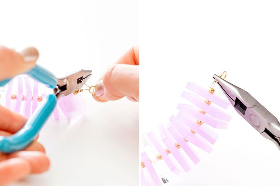 Once you’ve chosen a design, string alternating gold beads and acrylic tiles onto your wire.