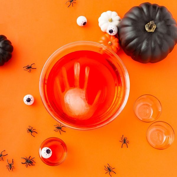 1. Drop a frozen hand in your party punch. This one is SO brilliant, and it’s crazy easy to make. Simply fill a food-safe disposable glove with water, tie it closed, and pop it in the freezer the night before your party. Right before your guests arrive, use scissors to remove the glove and drop it in the punch. (Pssst: The fingers melt fast! To keep the spook factor alive all party long, we suggest you make a few frozen hands.)