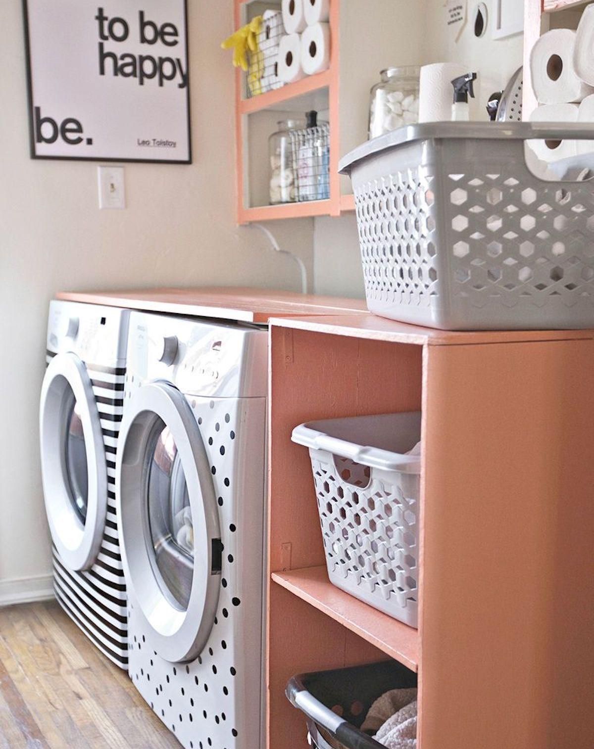 If your washer and dryer are already taking up some floor space, add a counter right on top that can serve as a folding station or detergent table. Feel free to add some extra storage cubes for good measure. (via A Beautiful Mess)