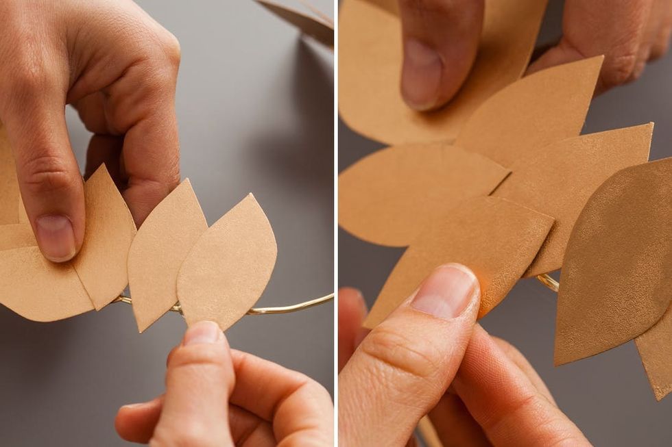 For this next part you need to be swift because the glue dries quickly. Squeeze a dollop of glue onto the wire and add a leaf cluster facing forward. Add more glue and another leaf pair that slightly overlaps with the first. Keep adding more until you get to the back section of the crown.