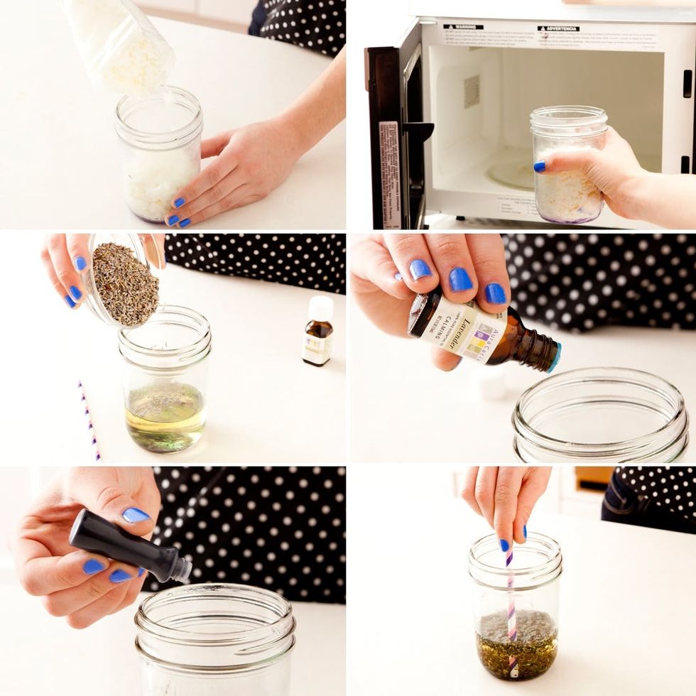 Pour about one cup of candle wax into a mason jar and microwave for about two minutes. You may need to stir in-between. Add dried lavender, lavender oil, and purple food coloring (all to your desired amount). Stir all the ingredients together. *Note* The liquid won’t turn purple, but their will be a soft purple hue once the wax has settled.