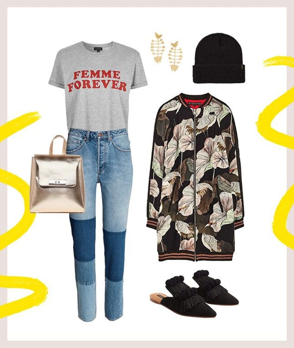 Whether you’re kickin’ it in your favorite coffee shop or hunting down vintage treasures at a morning flea, make patchwork jeans, a fiercely feminist tee, and a graphic bomber jacket your new signature. Embellished slides exude It-girl edge and require zero effort (who has time for laces?), while funky fishbone earrings and a metallic backpack add just the right amount of polish.