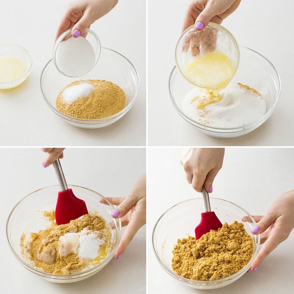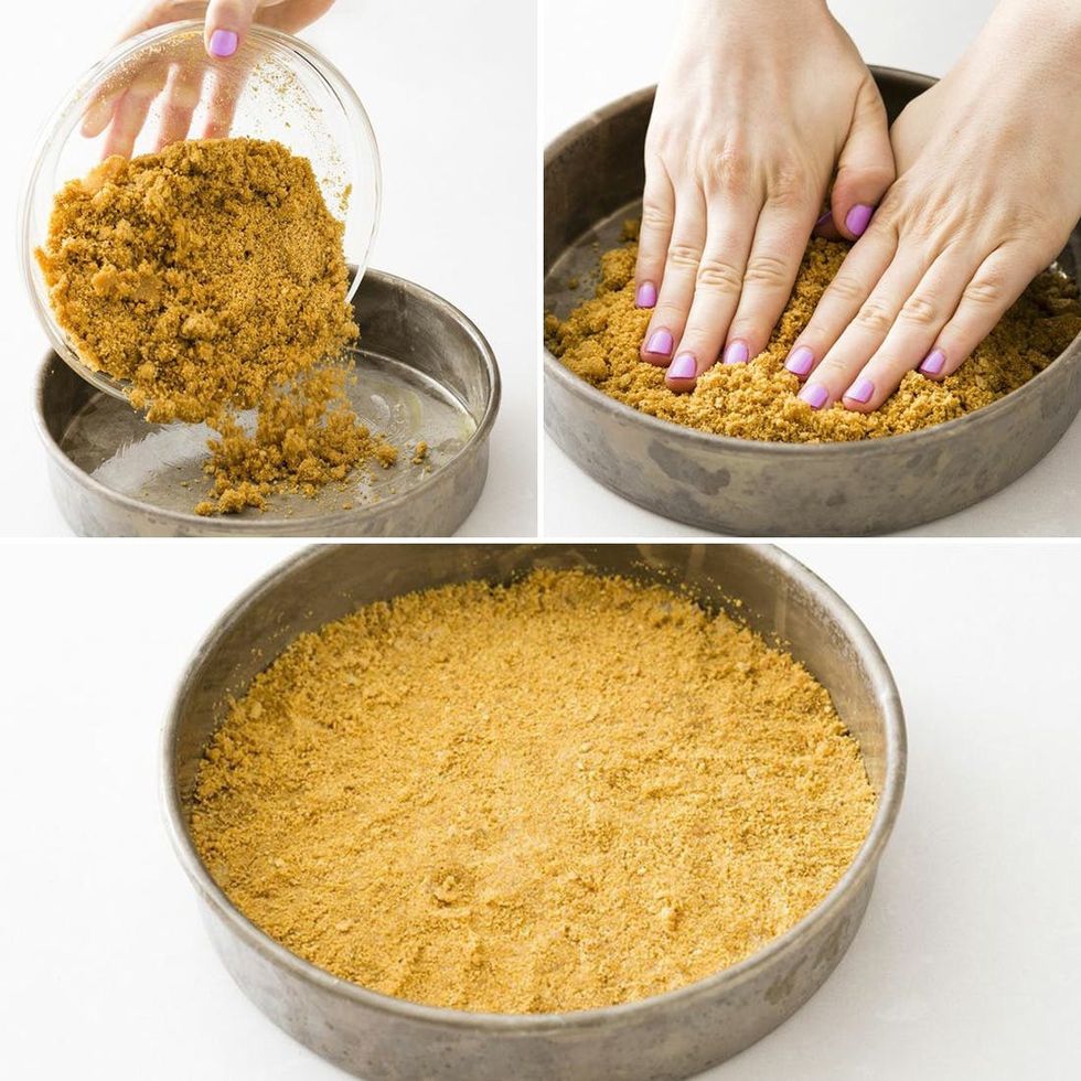 - Preheat oven to 325 degrees F. In a large bowl, combine the graham cracker crumbs, melted butter and sugar. Mix. Press into the bottom of a greased 9” pie pan. Bake for 10 minutes. Let cool 10 minutes.