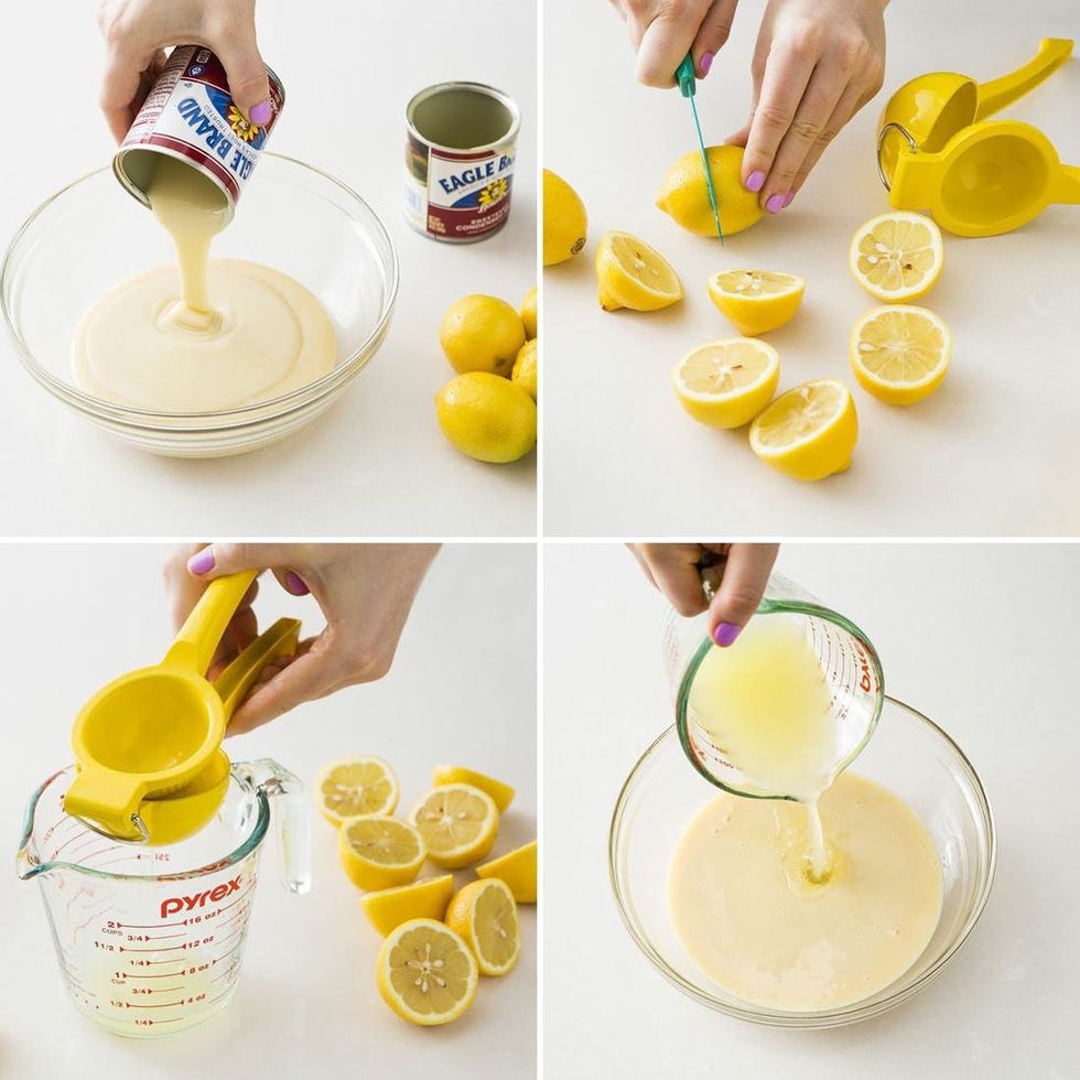 Preheat oven to 375 degrees F. Combine condensed milk and lemon juice in a large bowl.