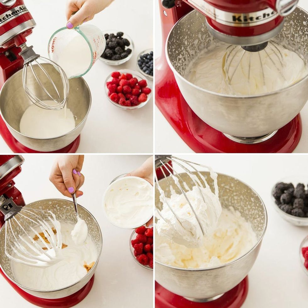 - In a stand mixer, beat heavy whipping cream until soft peaks form. Add vanilla and sour cream. Fill a piping bag with whipped cream.