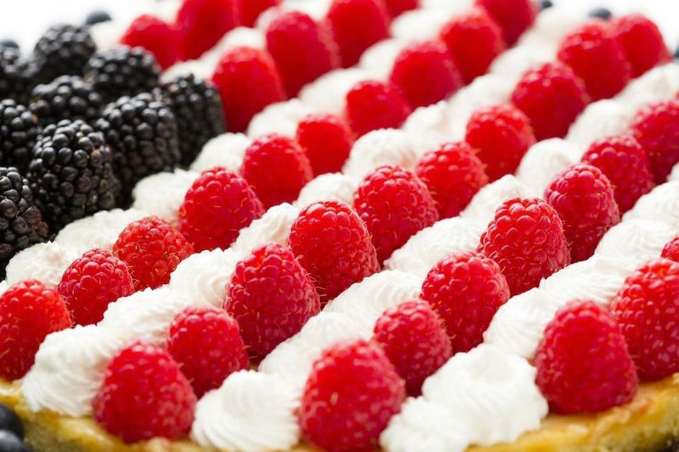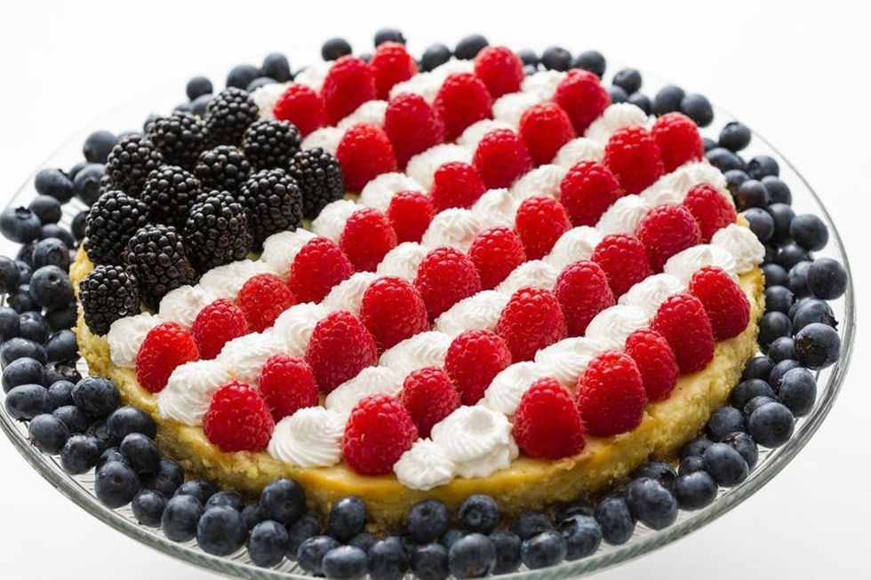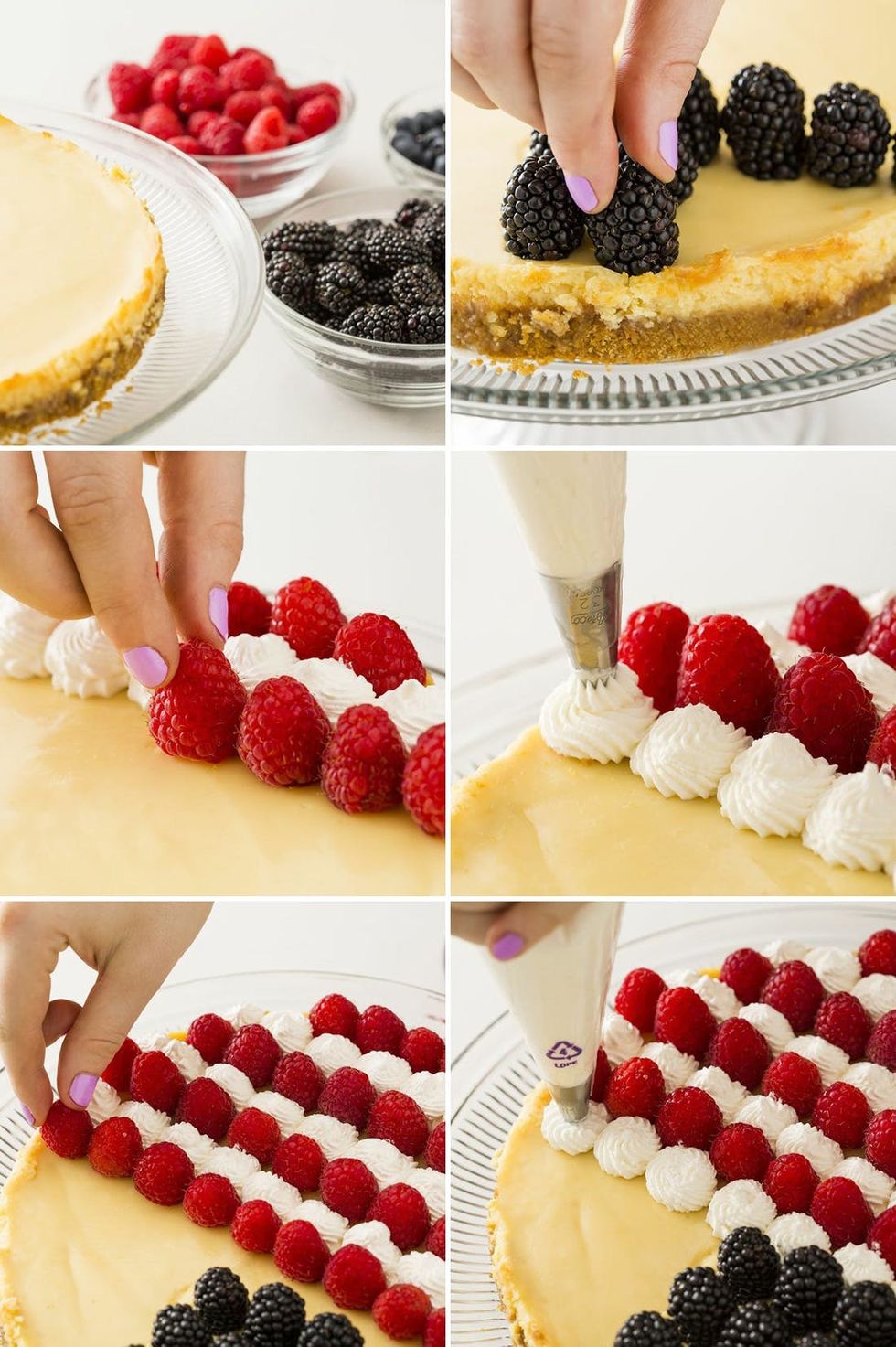- Time to decorate! Fill the upper left-hand corner of the pie with blackberries. Then, starting at the bottom, place raspberries in a row and alternate with a row of whipped cream. Continue until the pie is covered. Garnish the cake plate with blueberries. Enjoy!