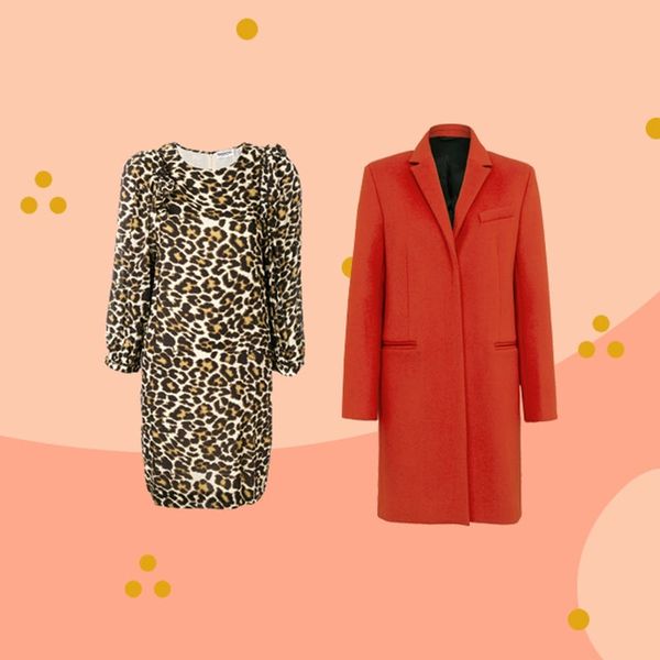 Clockwise from top left: Essentiel Antwerp Leopard Print Shift Dress ($218), French Connection Platform Felt Long Sleeved Smart Fit Coat ($298), Banana Republic Celestial Linear Earring ($58), Rebecca Minkoff Amelie Flat ($250), Mango Floral Embroidery Bag ($80)