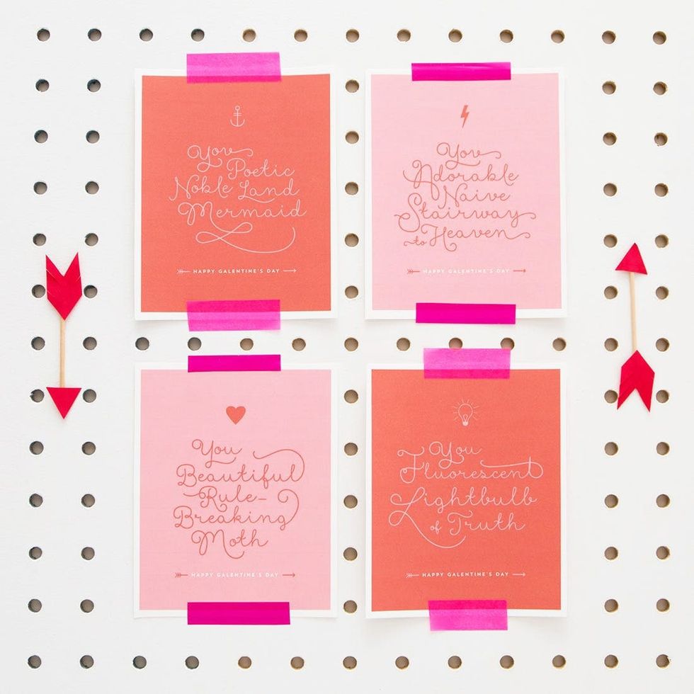 Scroll on to check 'em out and then download your faves. All you need is a color printer and scissors or an X-acto knife to make all your last-minute printable dreams come true. If you're hitting up a local copy shop or FedEx Kinko's, print a few extras and give them to your whole crew. Everyone could use a little extra love :)