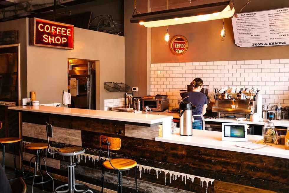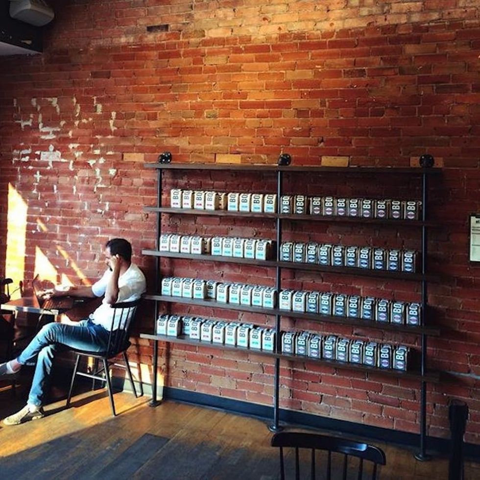 Black Eye, Denver, CO: This coffehouse has an old-school neighboorhood feel with its brick walls, vintage wood furniture, and roll-up garage door. (Photo via Black Eye)
