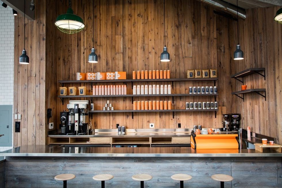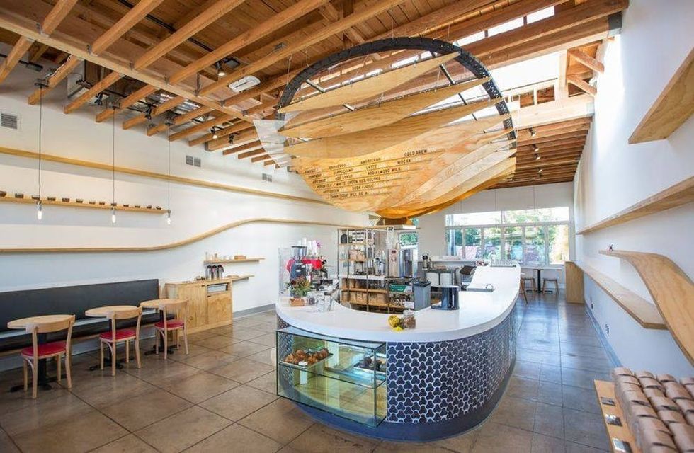 This Silver Lake cafe — owned by the Cards Against Humanity co-creator — is big on style, with blond wood everywhere and a large white bar in the center. (Photo via Elizabeth Daniels/Dinosaur Coffee)