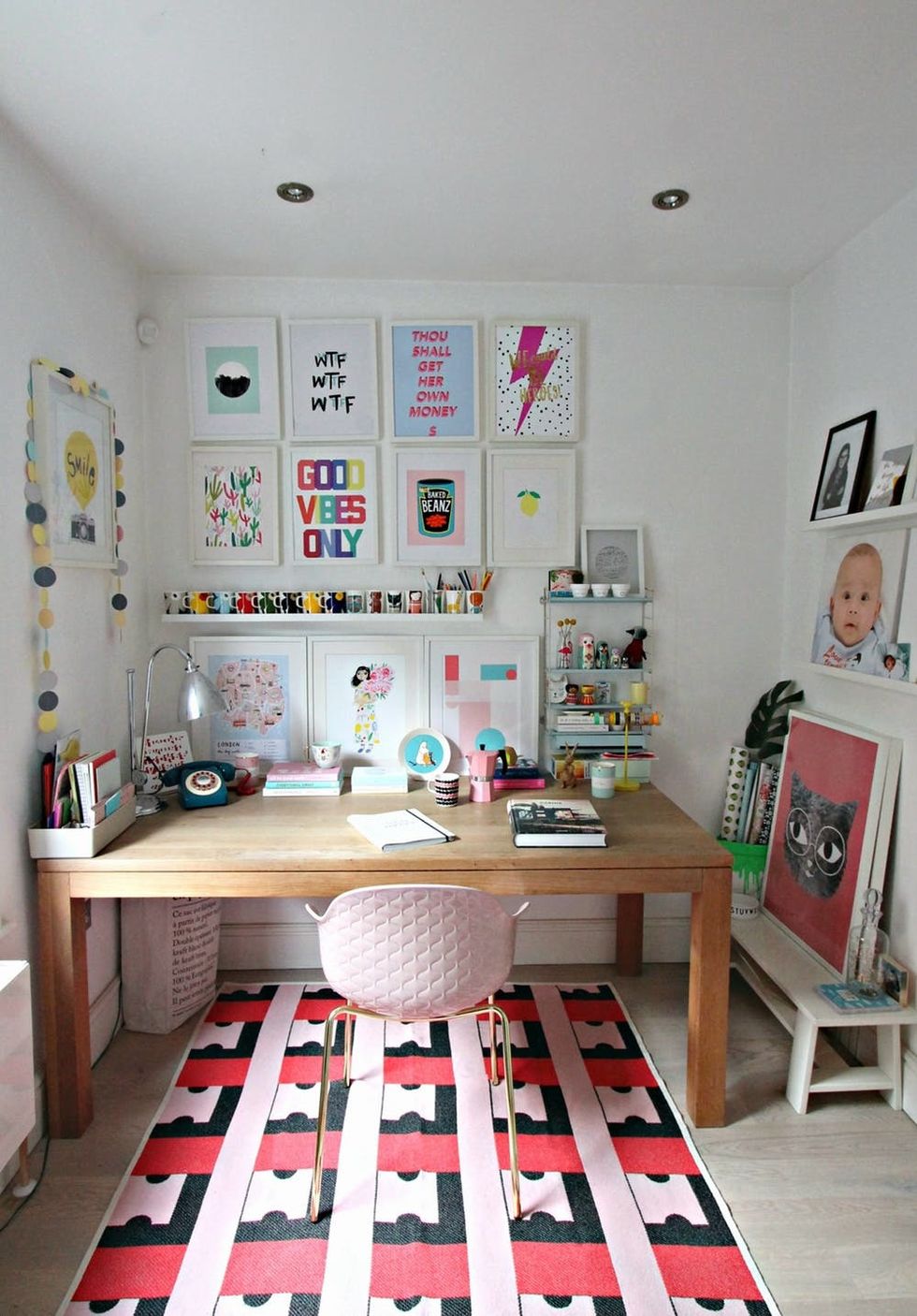 Who could sit at this desk and not feel inspired? The graphic rug punches up the small space and balances out the amazing artwork above.