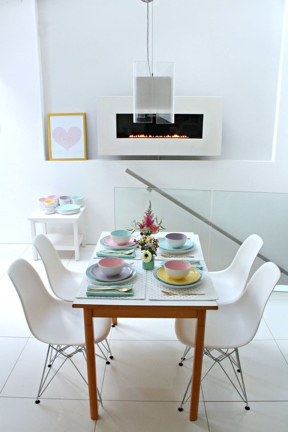 Even in spaces where white is the predominant color, Tan never misses an opportunity to inject some cheerful (and very springy) shades into the mix.
