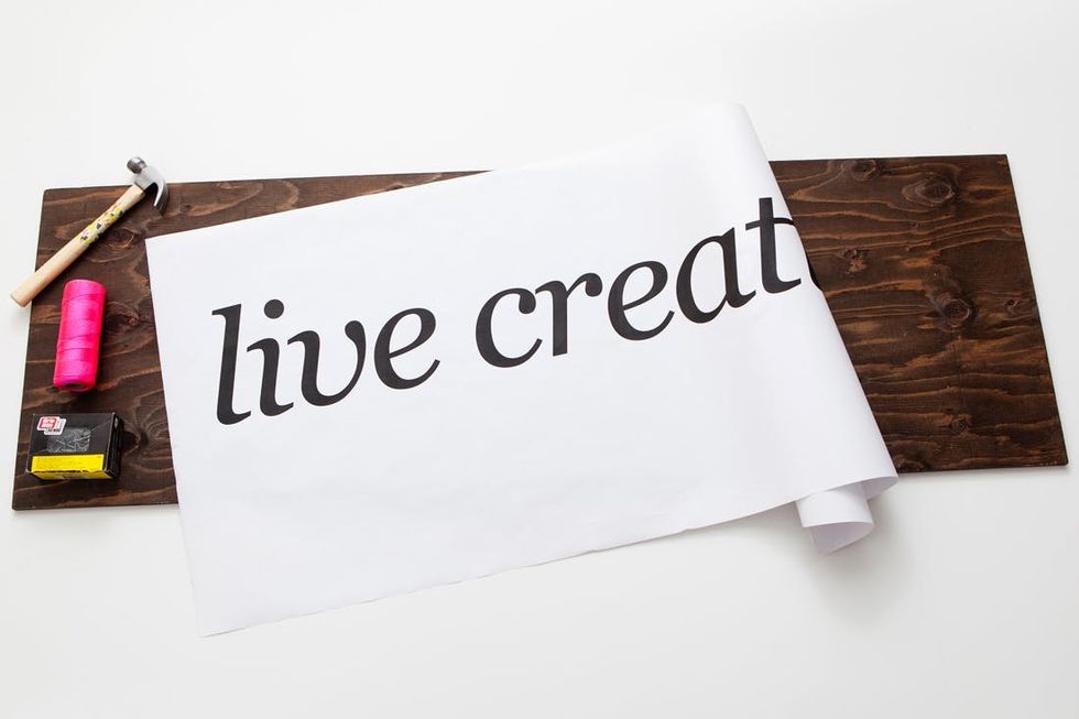 As you might know, we’re still putting the finishing touches on our office space here at Brit HQ. So we’re always excited to make (and share!) new pieces to decorate our space. Hence our newest addition, the Live Creatively sign! We are always down for inspirational quotes, and the hot pink string is just a bonus ;)