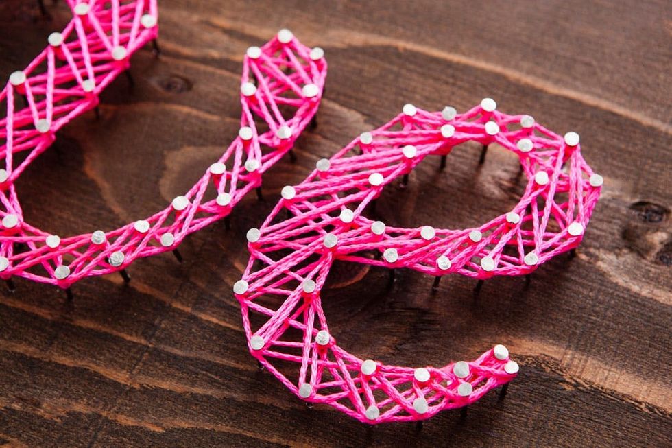 Time to string, Tie a knot onto one nail, then in a zig-zag pattern wrap the string around all of the nails. Tie it off at the end and snip off the extra cord.