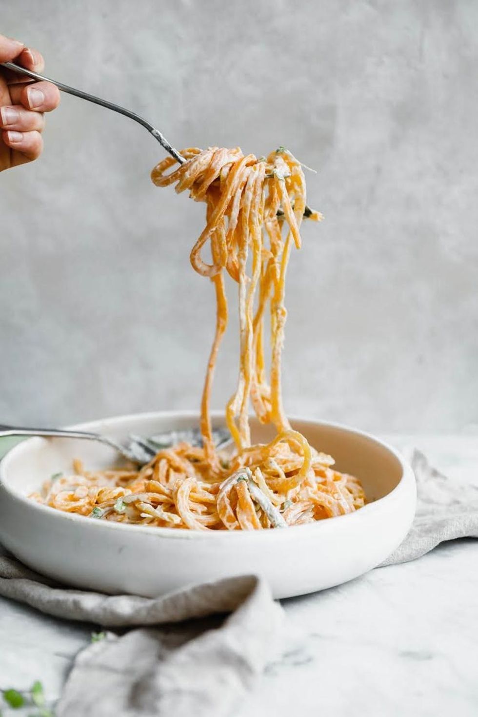 14. Butternut Noodles With Cashew Alfredo: Long tangles of butternut squash noodles make for a lunch you’ll slurp right up. A decadent vegan cashew Alfredo sauce coats each bite with flavor. (via Inspiralized)