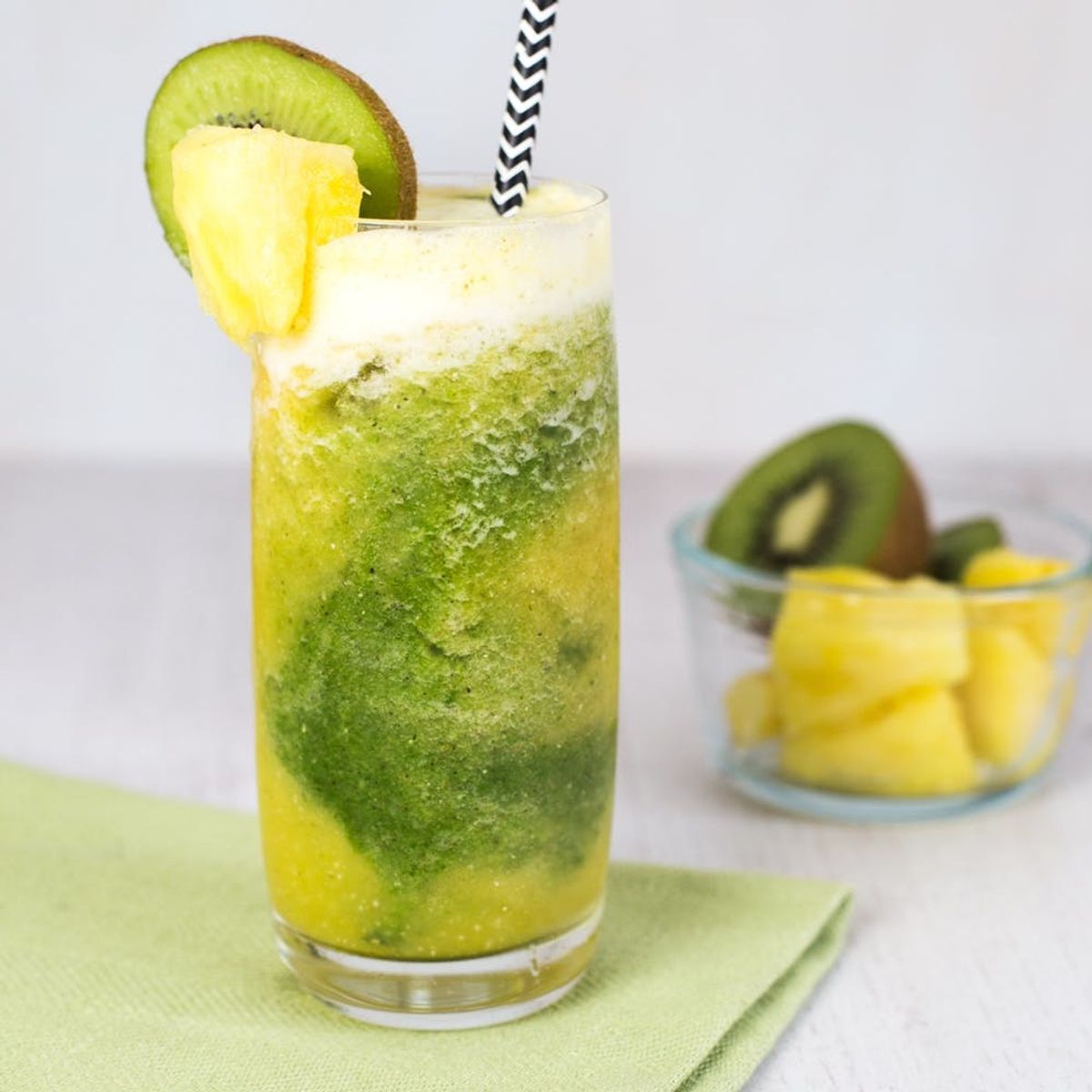 Pour the kiwi smoothie over the pineapple smoothie, and use a spoon or straw to gently swirl the two colors together. Serve immediately.