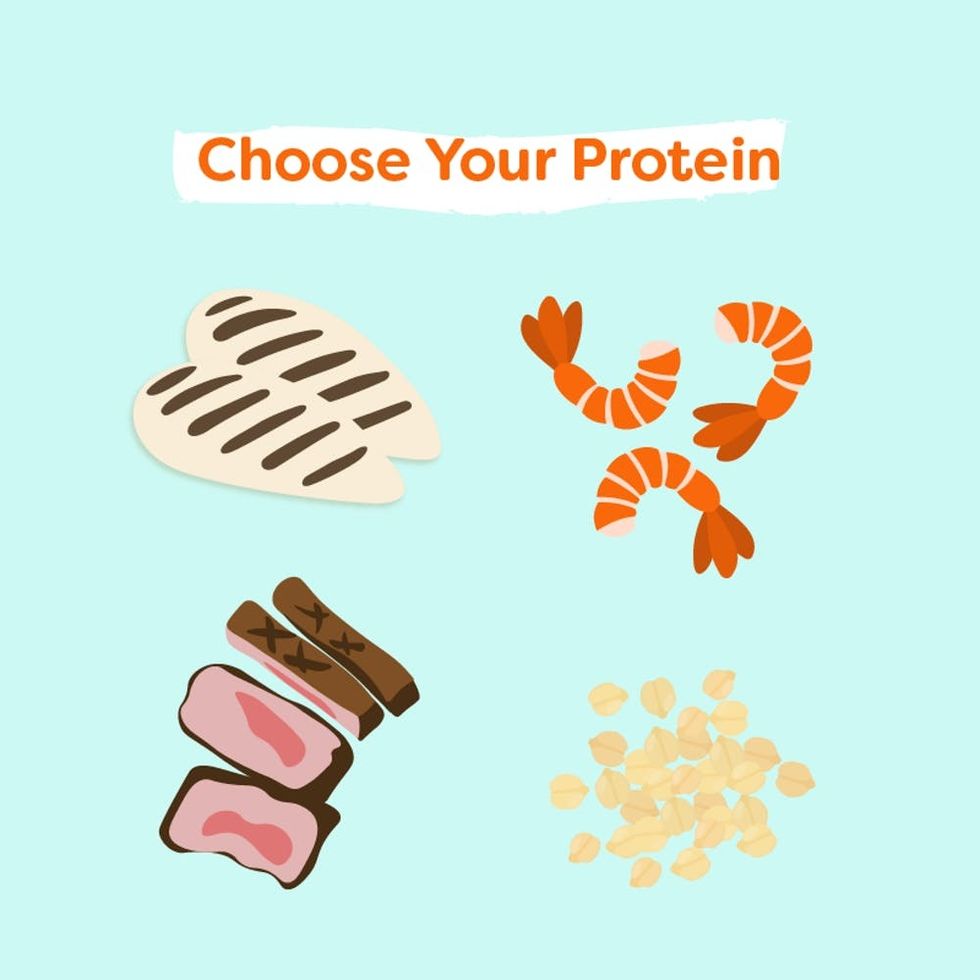 Picking your protein is fun! Options are interchangeable and, no matter your diet, you can change things up quite easily to keep yourself from getting bored. Meat eaters can pile up on steak strips or shrimp — or both for a surf ‘n’ turf-inspired meal — while those on a plant-based diet can load up on tempeh, crispy tofu, or chickpeas.