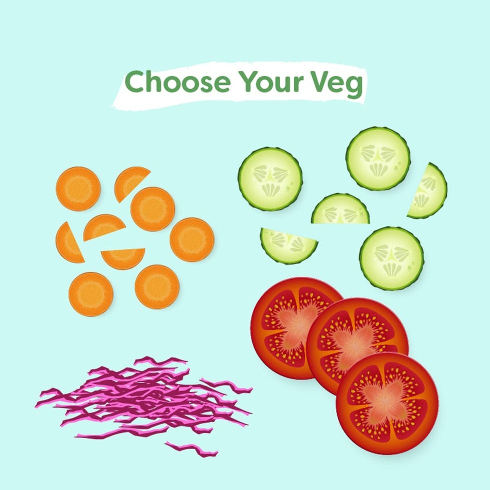This is where things get exciting and colorful! Whether your bowl is inspired by East Asian flavors or the Mediterranean, try shredded carrots, crisp cucumbers, and bright red cabbage. Then add more flavor-specific things to your meal, like edamame or garlicky olives, depending on your bowl style.