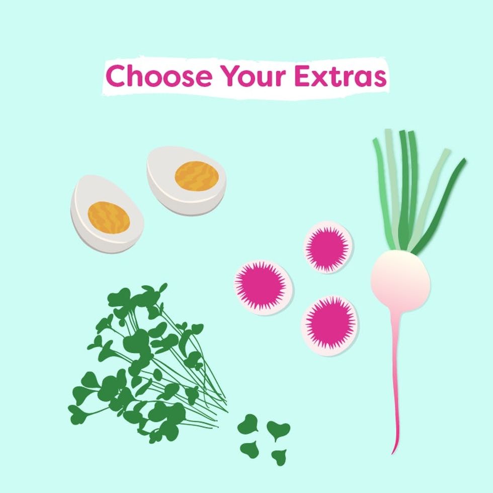 Add extra color, texture, and nutrients to your bowl with microgreens, nuts and seeds, or hard-boiled eggs. For wow factor, watermelon radishes are always a welcomed addition.