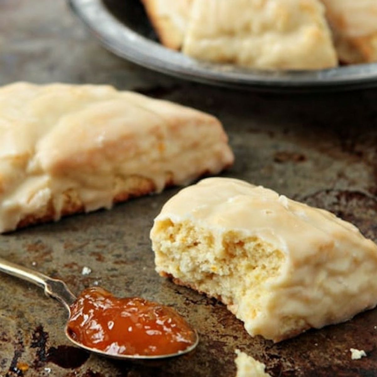 For an easy glaze that can go on almost any baked good, like this orange scone glaze from My Baking Addition, combine powdered sugar with orange juice until the consistency is thin enough to whisk the lumps out but thick enough to drizzle without being runny. You can even grate in some orange peel for an extra powerful flavor boost.