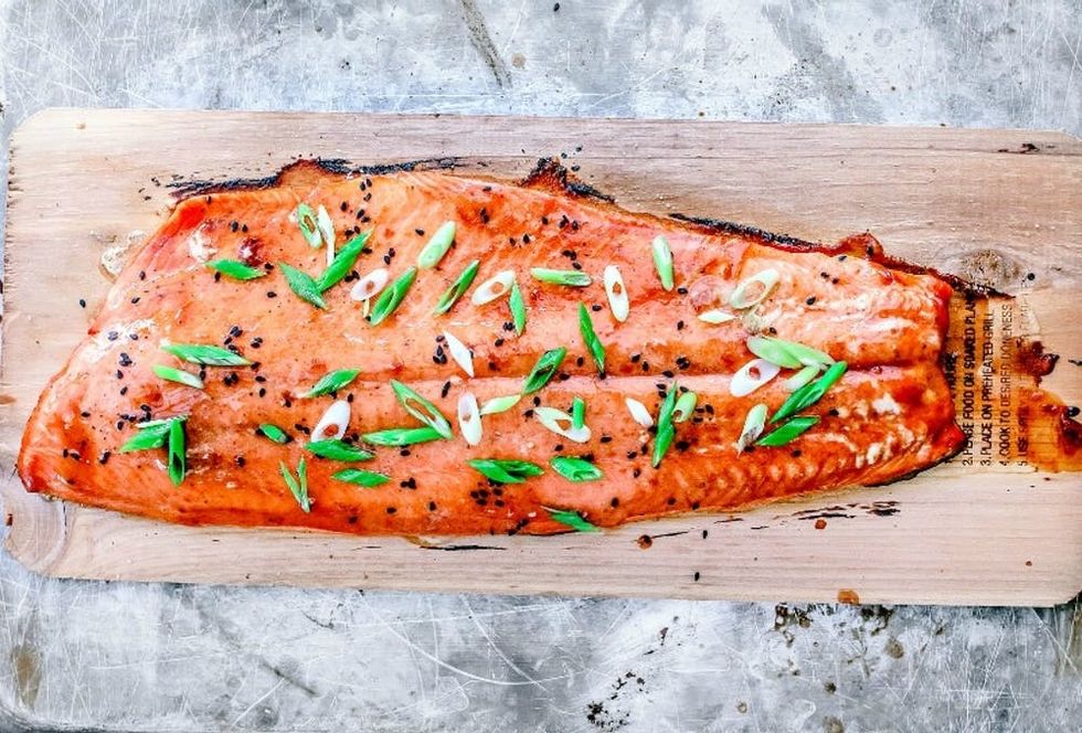 - Carefully flip the plank over so that the charred side is facing upward; place the salmon on top. If you’re using a sauce, slather it on now. Top it with fresh herbs and slices of citrus fruit for extra flavor infusion.