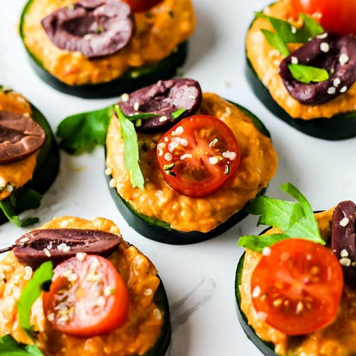 You can easily nourish and refresh yourself with these crunchy cucumber bites. They’re smothered with hummus and topped with tomatoes, briny olives, and hemp seeds. (via Emilie Eats)