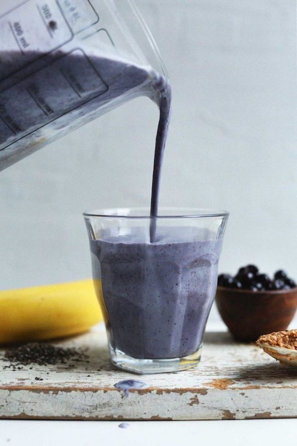 2. Nut Butter: Also in the healthy fat category, nut butters add an extra dimension of flavor and boost the creaminess in your drink. Almond butter is a standby — try it in this Blueberry Almond Butter Smoothie. (Recipe + Image via Minimalist Baker)