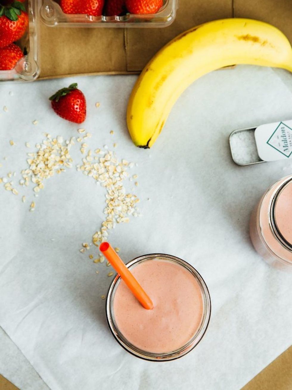 3. Oats: If your usual smoothie leaves you feeling hungry after 15 minutes, consider tossing in some oats. The added fiber will keep you satisfied longer. This Strawberry Peanut Butter Oatshake looks pretty tasty too. (Recipe + Image via Oh, Ladycakes)