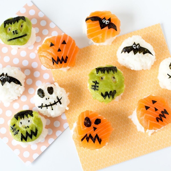 - For the pumpkin design, layer a slice of salmon on top of a ball of rice. Use tweezers to place small triangles on the salmon for the eyes and nose, then use a zig-zag shape for the mouth.
